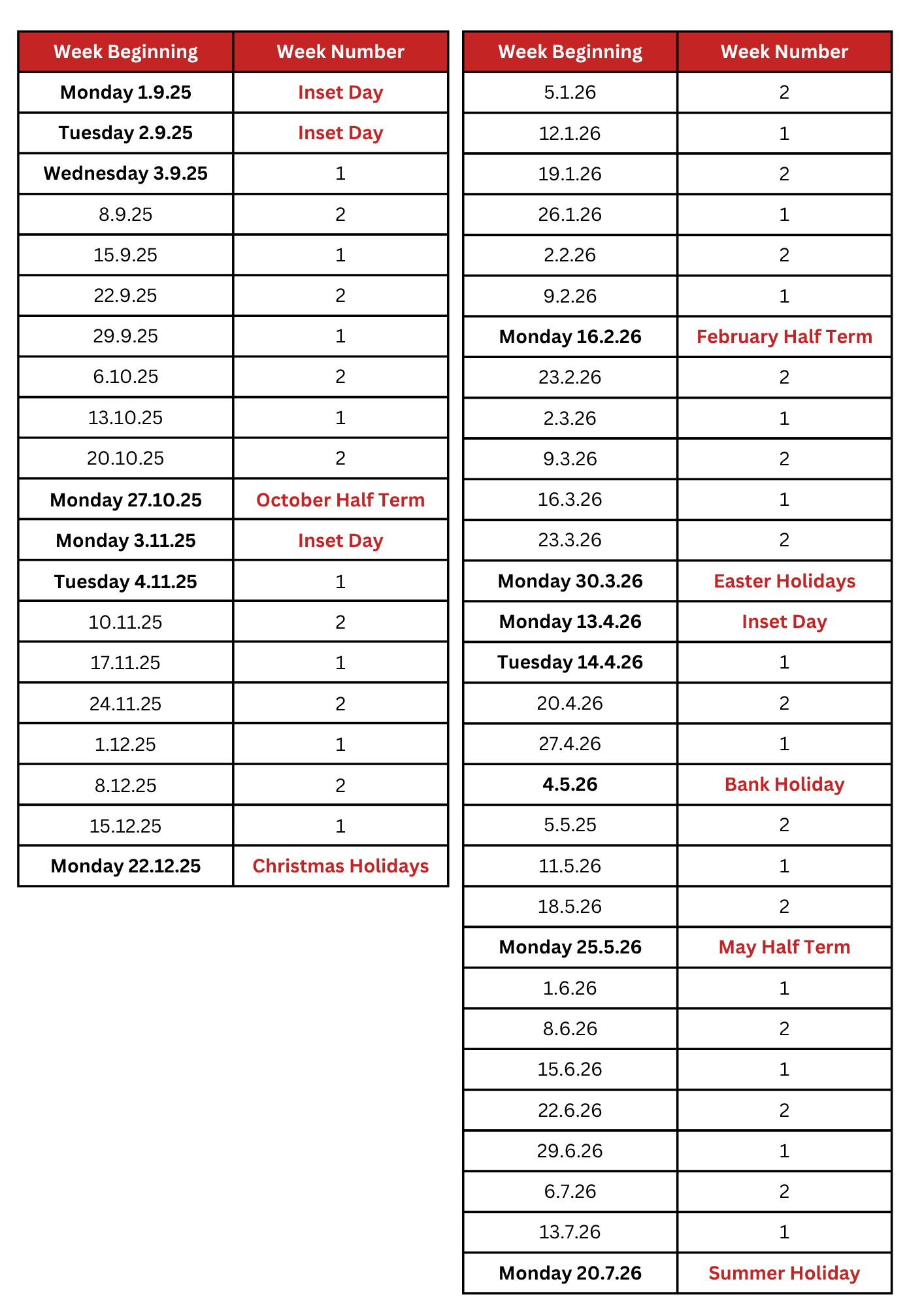 We work on a two-week timetable. See the calendar below for details of which timetable week it is: